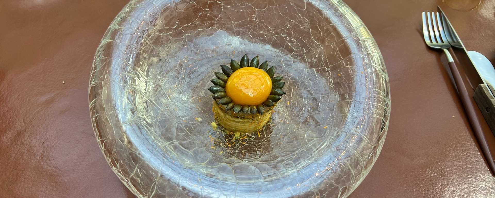 The bonus dish was caviar with an egg yolk, pastry, and sunflower seeds. The sunflower seeds were arranged as petals, and so it looked like a reverse sunflower. This dish was a great combination of contrasting textures and flavors, and a great pairing with the vodka.