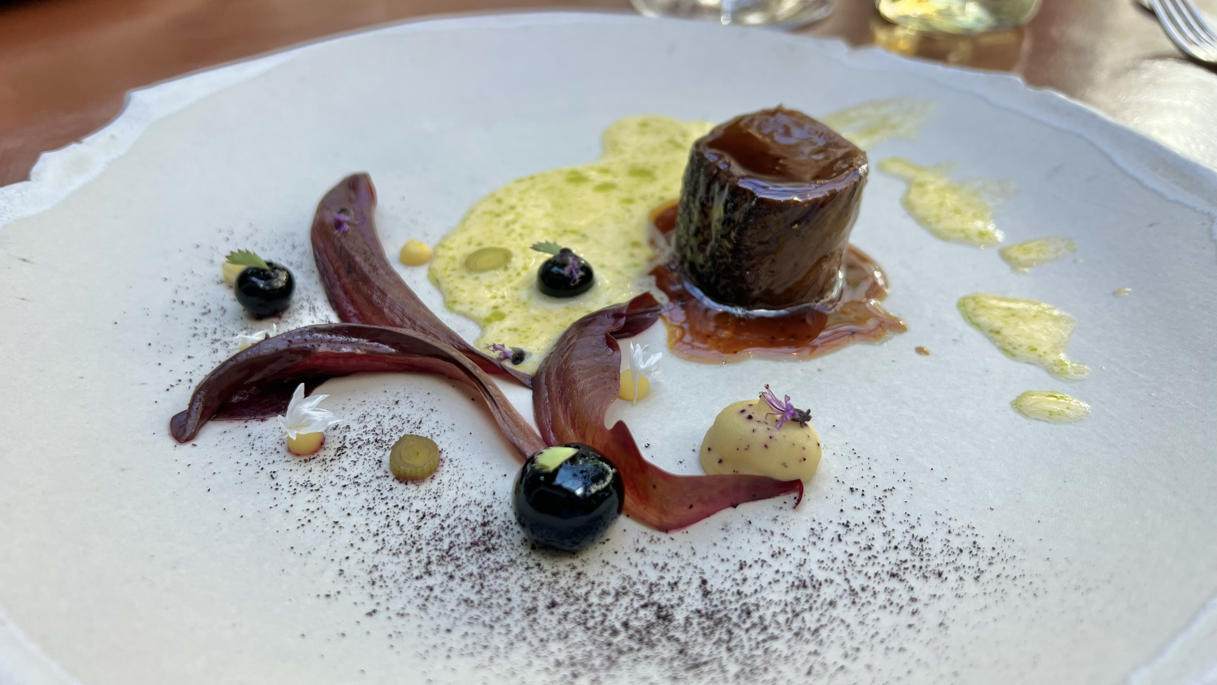 It was paired with backstrap of roedeer venison with leeks, black pepper, blueberries, and radicchio. The venison was very tender and perfectly cooked. A pairing of venison with black pepper and Syrah makes sense, but the wine had some green edges that didn’t go away with the venison and the creamy sauce made it worse.