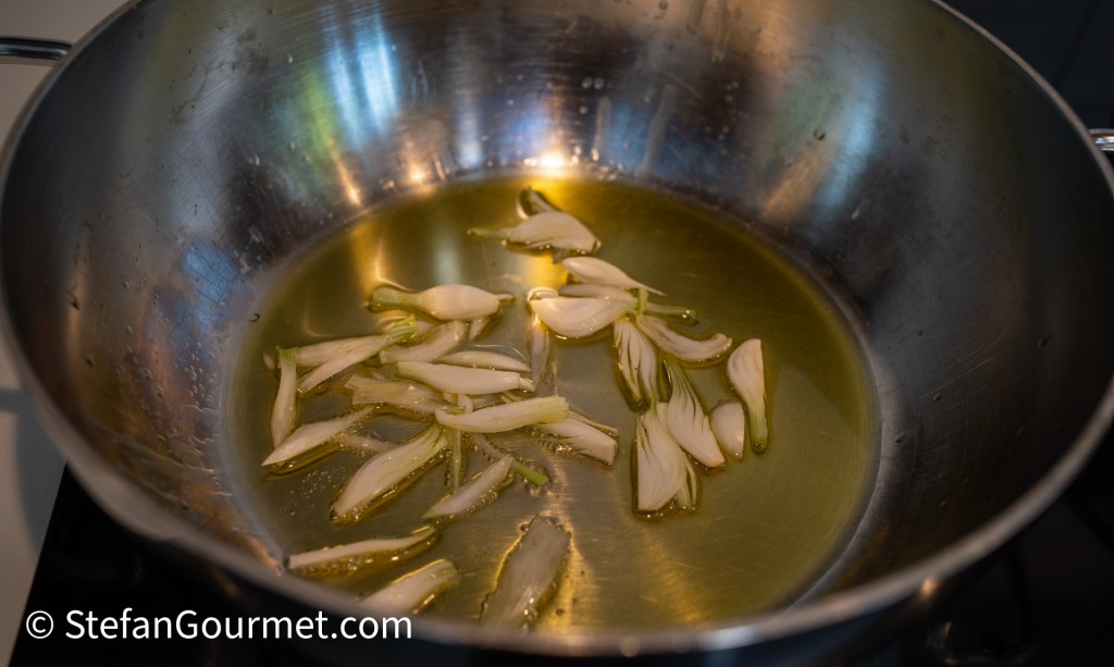 Heat 3 tablespoons of olive oil in a casserole and add the spring onion.