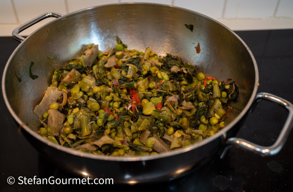 Then add the peas and stir for another 4 minutes. If you did not skin the fava beans, you should add them now too.