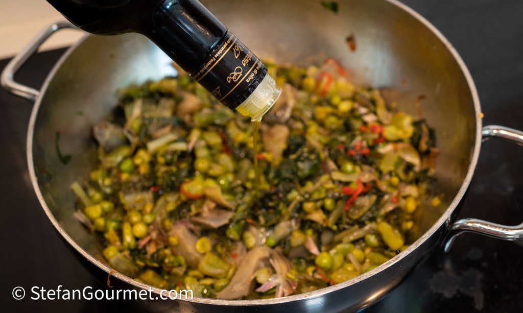Turn off the heat and drizzle with good quality extra virgin olive oil. The Vignarola is now ready to be served.