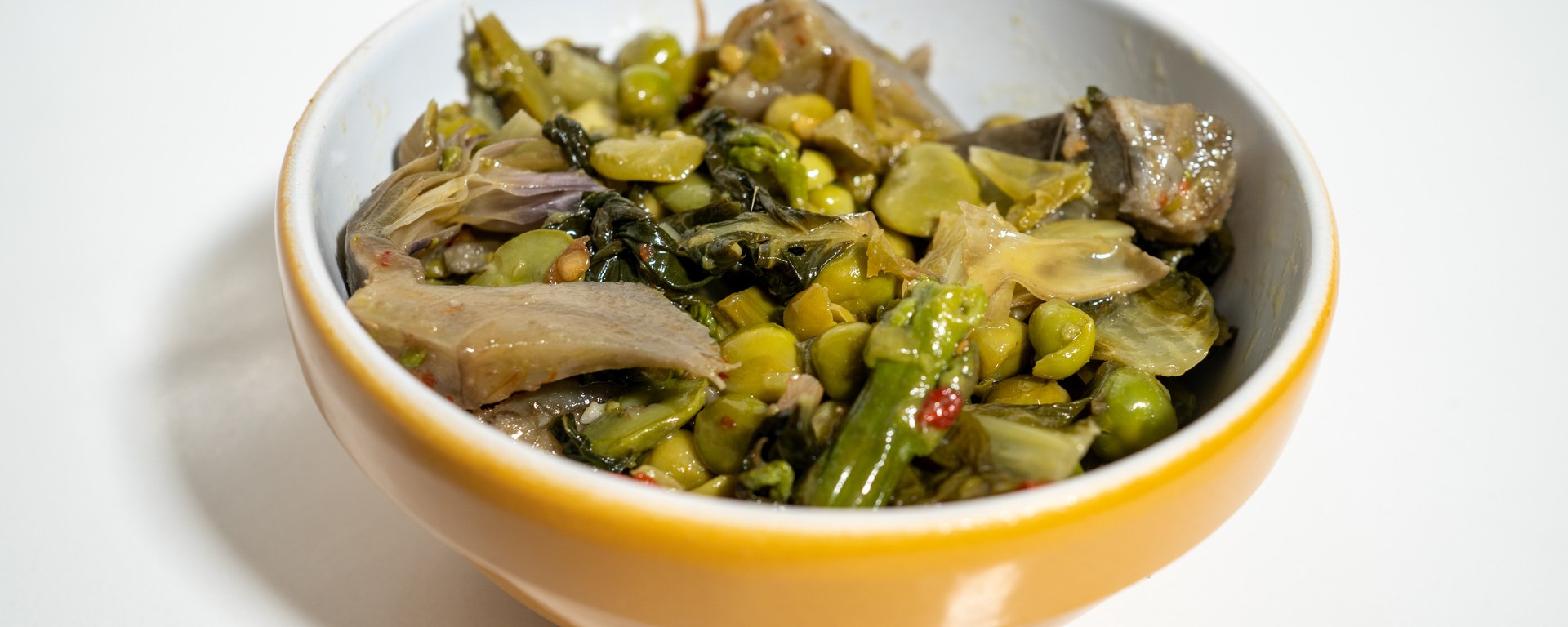 Turn off the heat and drizzle with good quality extra virgin olive oil. The Vignarola is now ready to be served.