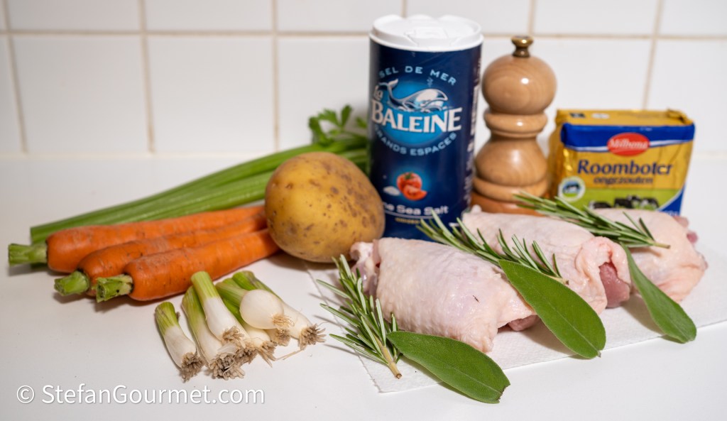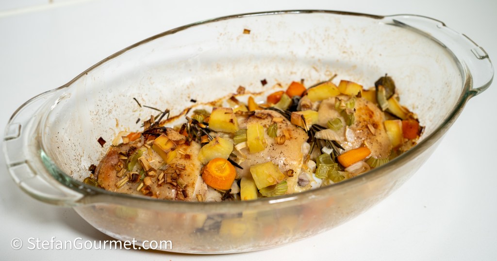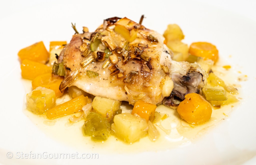This dish is very easy to prepare and remarkably delicious, as is often the case with simple but good ingredients prepared in the right manner. The book prescribes a whole chicken, but I used chicken thighs instead. It is important to use chicken thighs with skin and bones, as this is an important factor in the flavor and texture of the dish. And of course it is important to use good chicken (free range/organic).