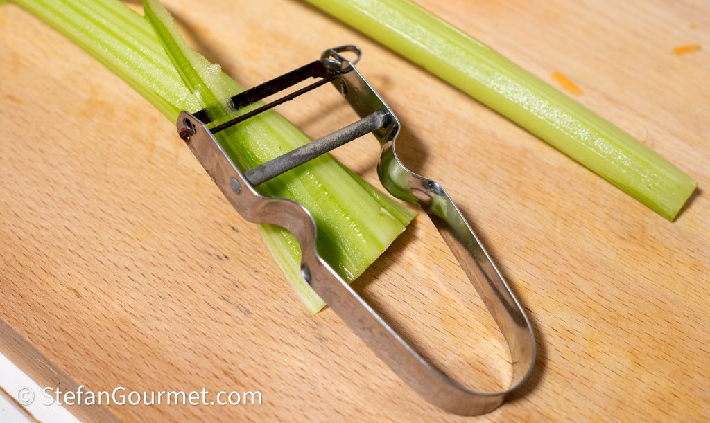 Peel the potatoes and carrots. Remove the tough fibre on the celery with a potato peeler.