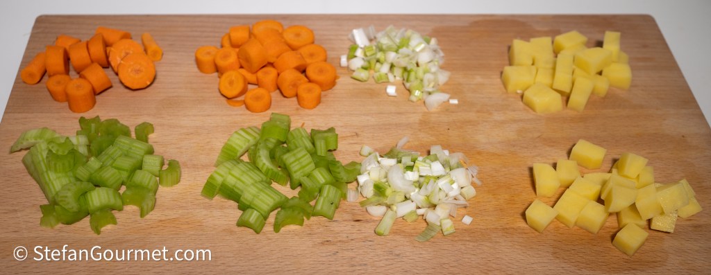 Thickly slice the carrots, celery, and cipollotti. Dice the potatoes. Divide each vegetable in halves.
