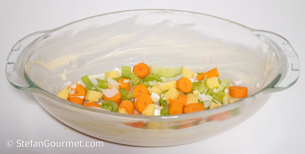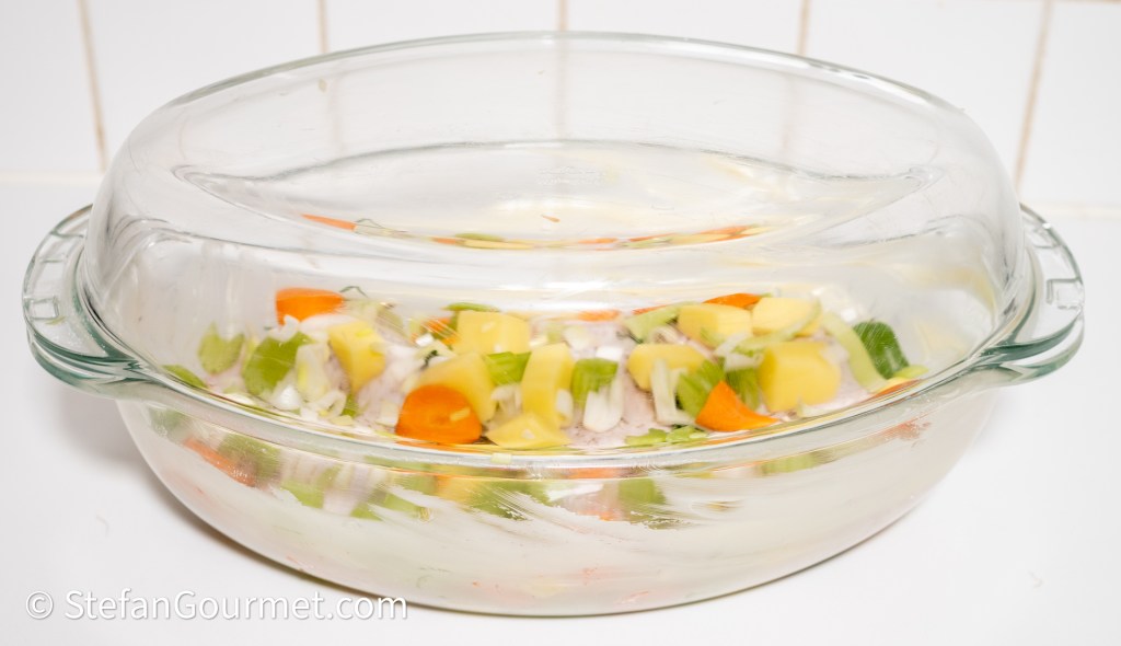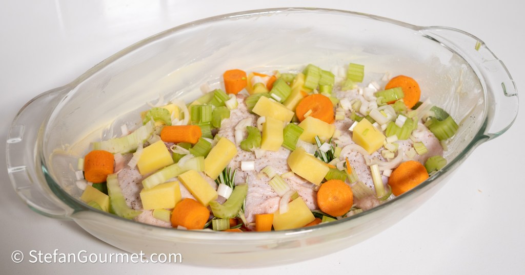 Select an oven dish with a cover (or a casserole or a Dutch oven) in which the chicken will fit snugly in a single layer. Grease the dish with butter. Cover the bottom with half of the vegetables. Season with salt.