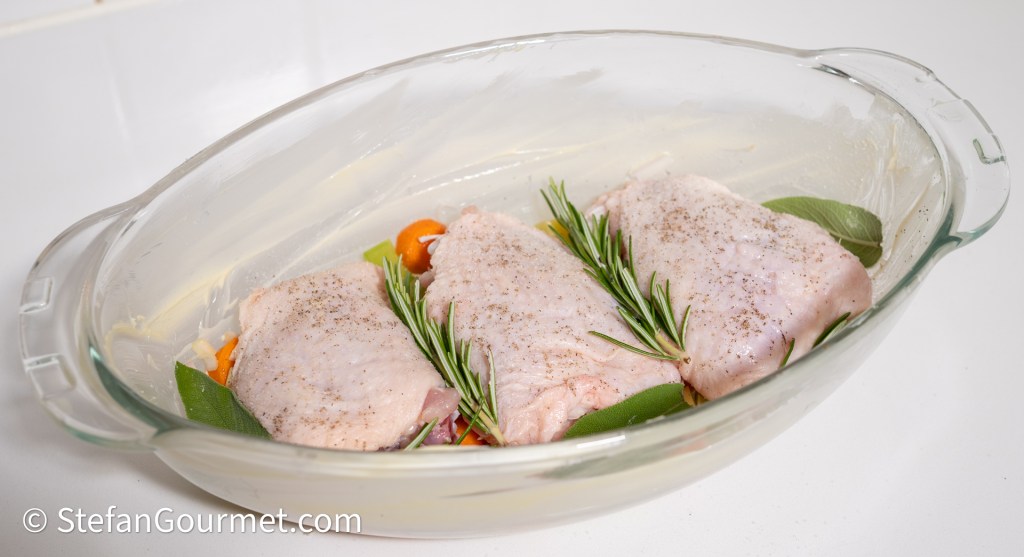 Season the chicken thighs with salt and freshly ground black pepper on both sides. Arrange them in a single layer on top of the vegetables. Arrange the sage and rosemary around the chicken.