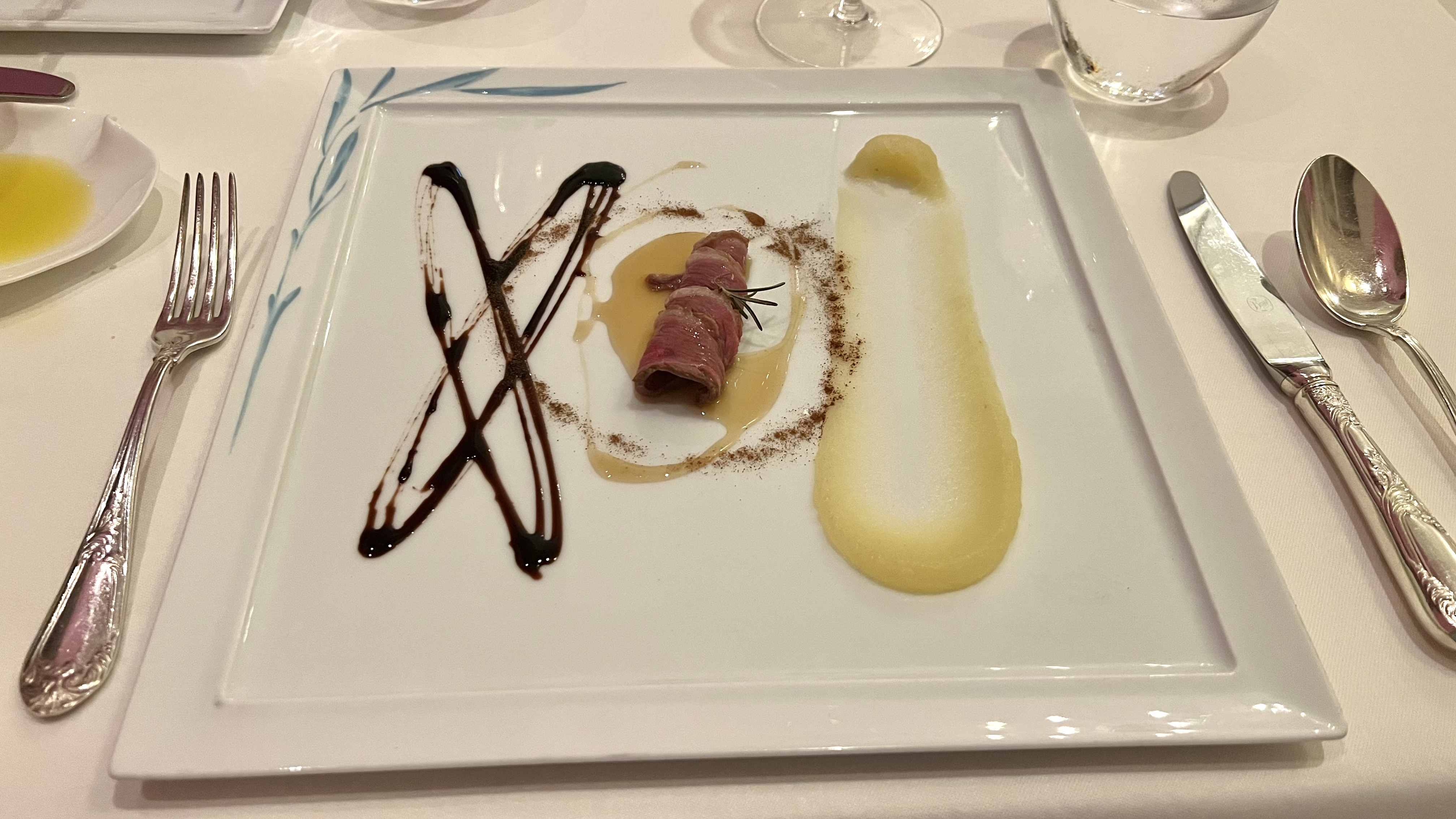 The wine was accompanied by the meat secondo: braised blade steak, marinated with oriental spices and served with a squash velouté, orange mostarda, wasabi, and borage powder. The meat was very tender and by itself a nice pairing with the wine. The mostarda, squash, and wasabi were nice with the beef, but not helping to bring out the best of the wine.