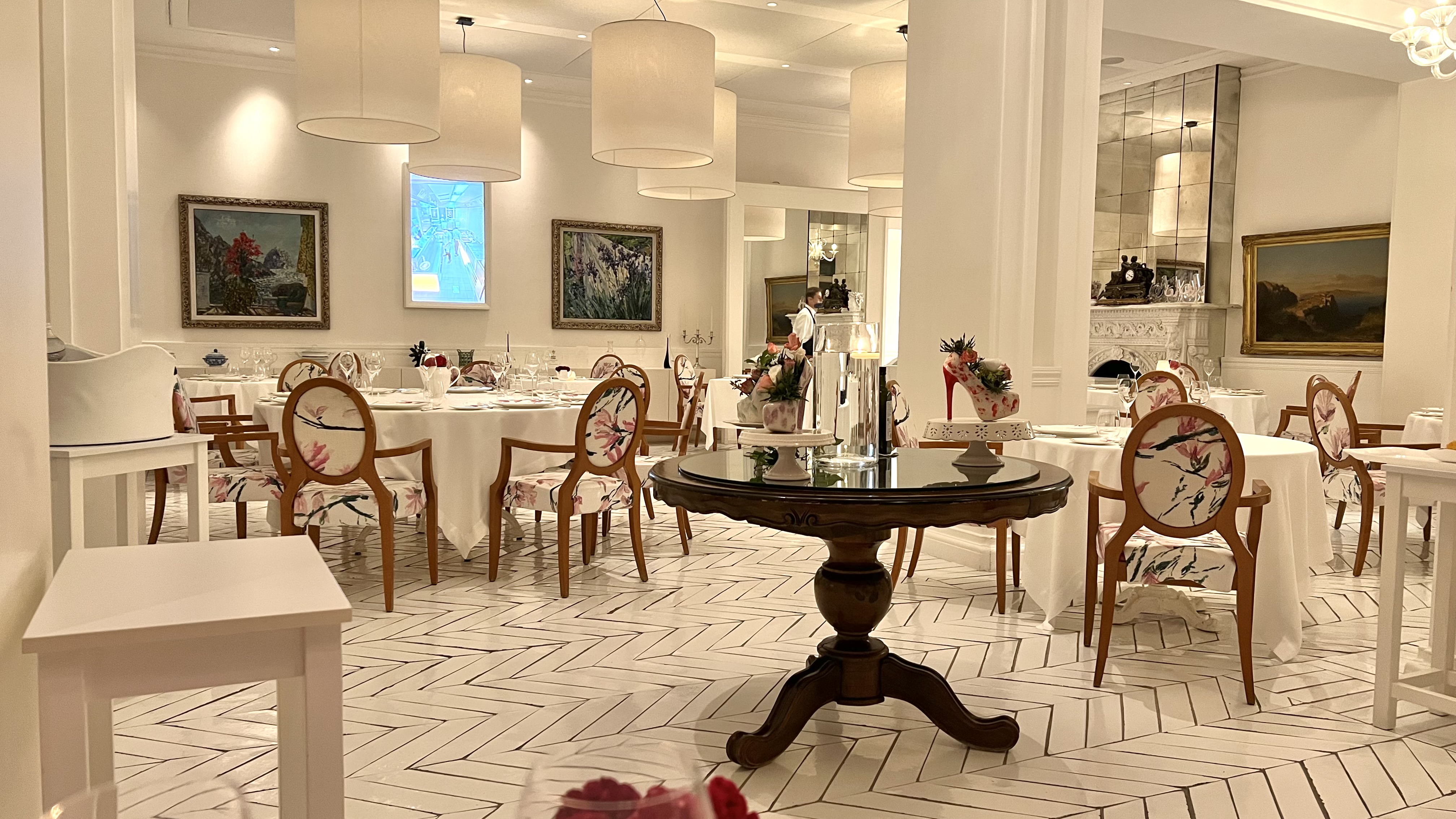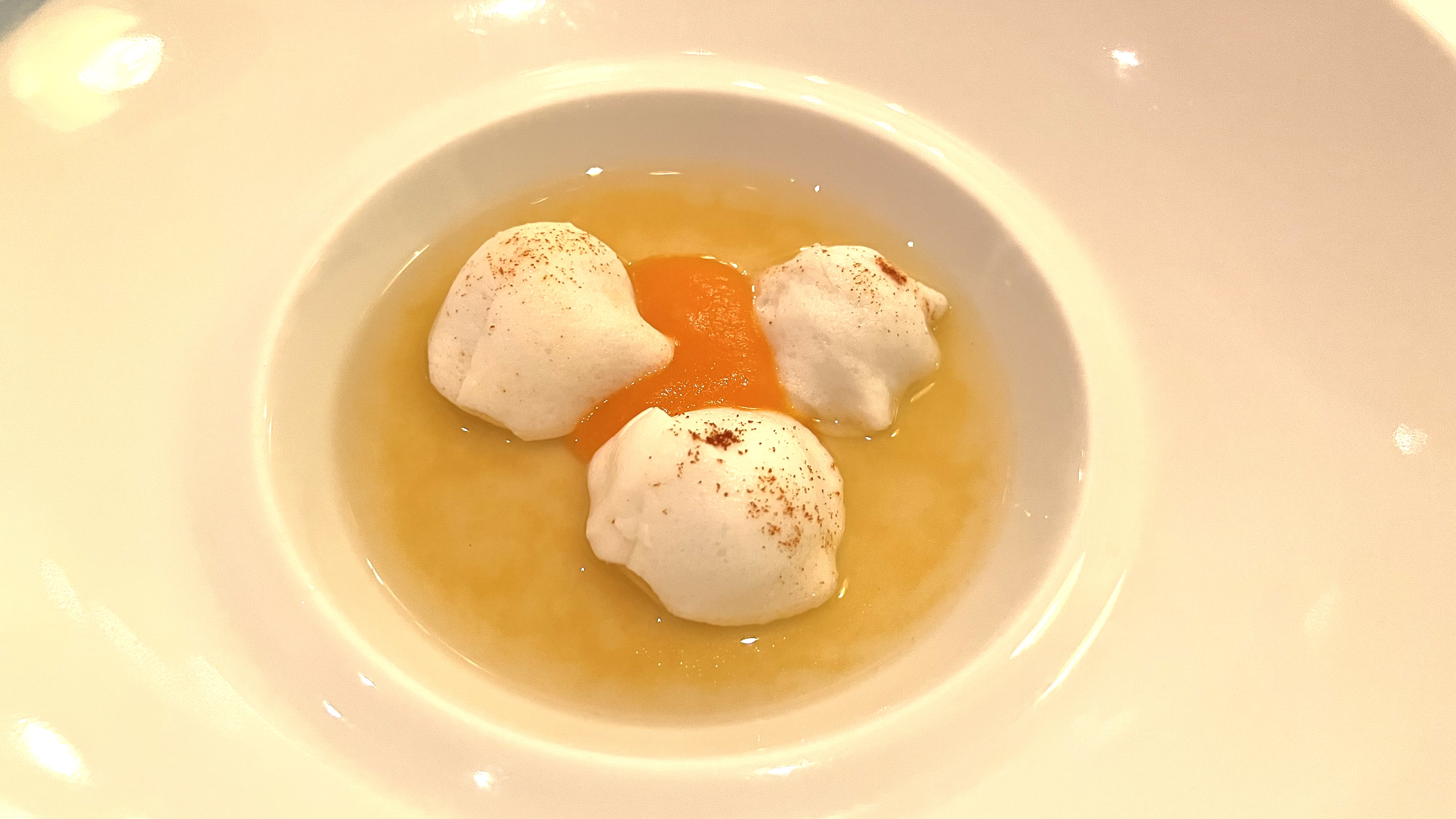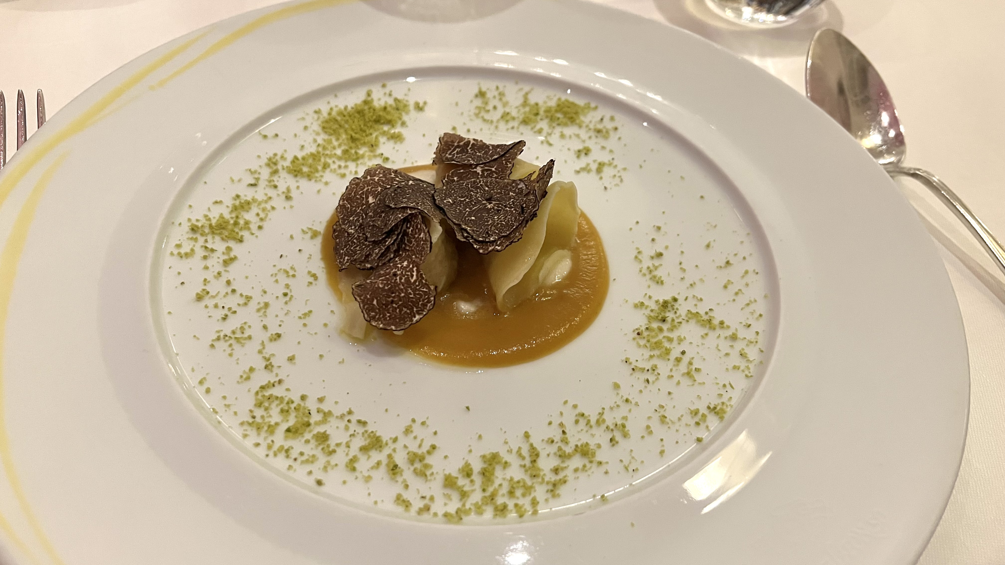 The decor is not exactly to our taste, but we know from our previous visit that the food and wine certainly are. We opted for la Degustazione, 7 courses for 190 euros, and the wine pairing, 5 glasses for 220 euros.