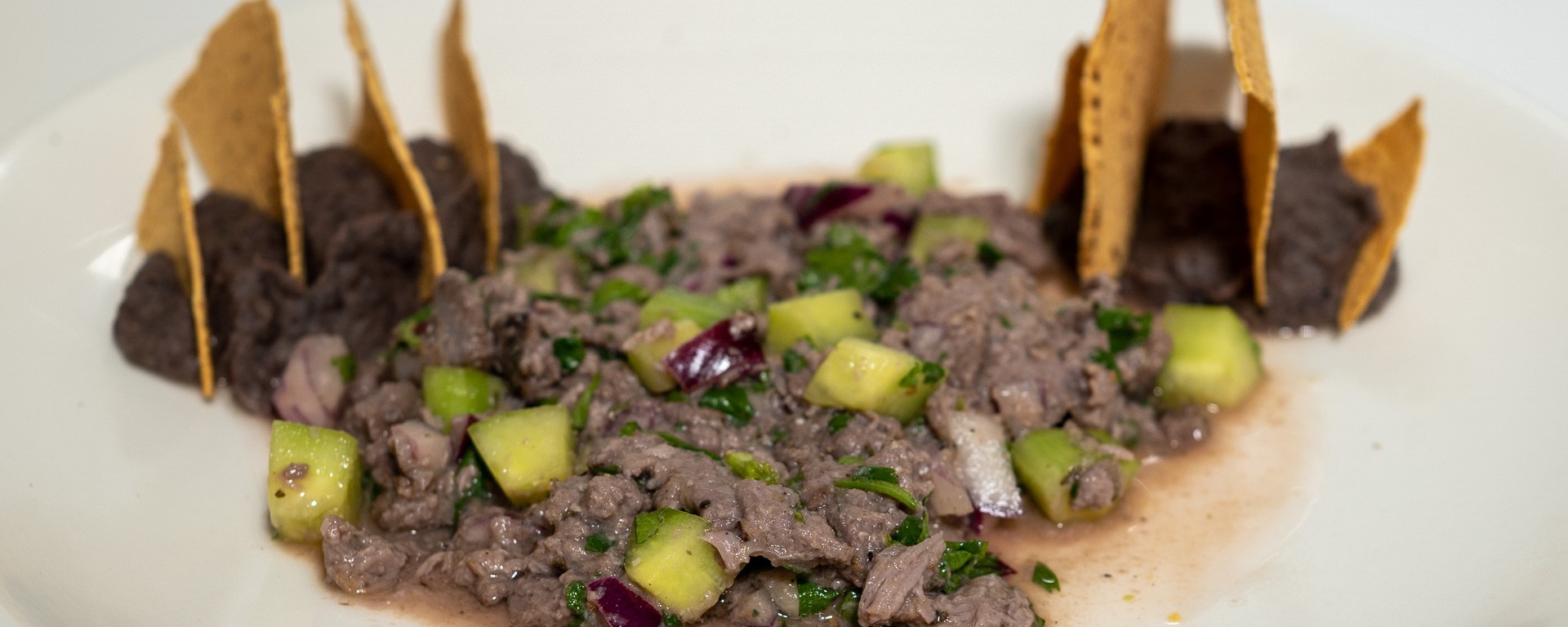 An unusual dish I enjoyed in Yucatán Mexico was Tzic de Venado, which is also written as Tsi’ik de Venado. Venado is Spanish for venison, and Tzic means something like pulled meat. So this is pulled venison. What makes it unusual, is that the pulled venison is served cold as a salad with onion, cilantro, Seville orange juice, cucumber, and and Mexican radishes. The venison is cooked with a spice mix called recado blanco, a ‘white’ spice mix from Yucatán. Spice mixes are called recado there, and there is also recado rojo (used for Cochinita Pibil) and recado negro (used for Relleno Negro). Tzic de Venado is served with crispy corn tortillas (tostados), and a soupy version of refried beans. The traditional way of is to prepare it wrapped in banana leaves, and then cooked in a hole in the ground with a fire of local hardwood. Sous vide is a great modern alternative for that. This dish is very suitable to prepare a batch of multiple portions at once, and then freeze them to be enjoyed later.