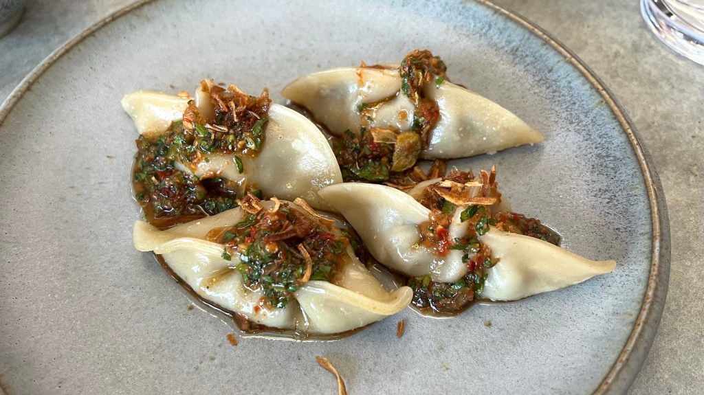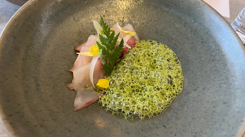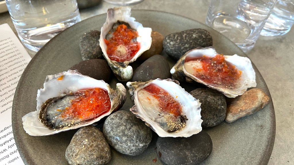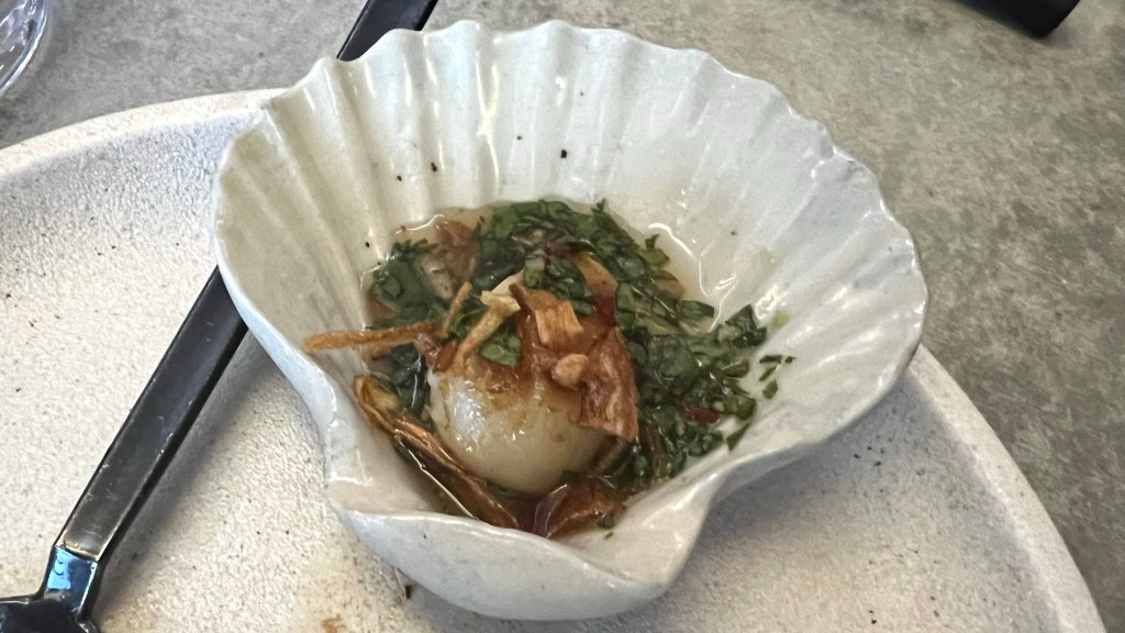 …and a scallop with nasturtium leaf nam jim jaew. This was paired with a Willie Smiths ‘Pet Nat’ Cider 2023 from the Huon Valley, Tasmania. In both sets the flavor intensity was quite different between the three appetizers, which made the pairing with the wine work better with some appetizers than with others.