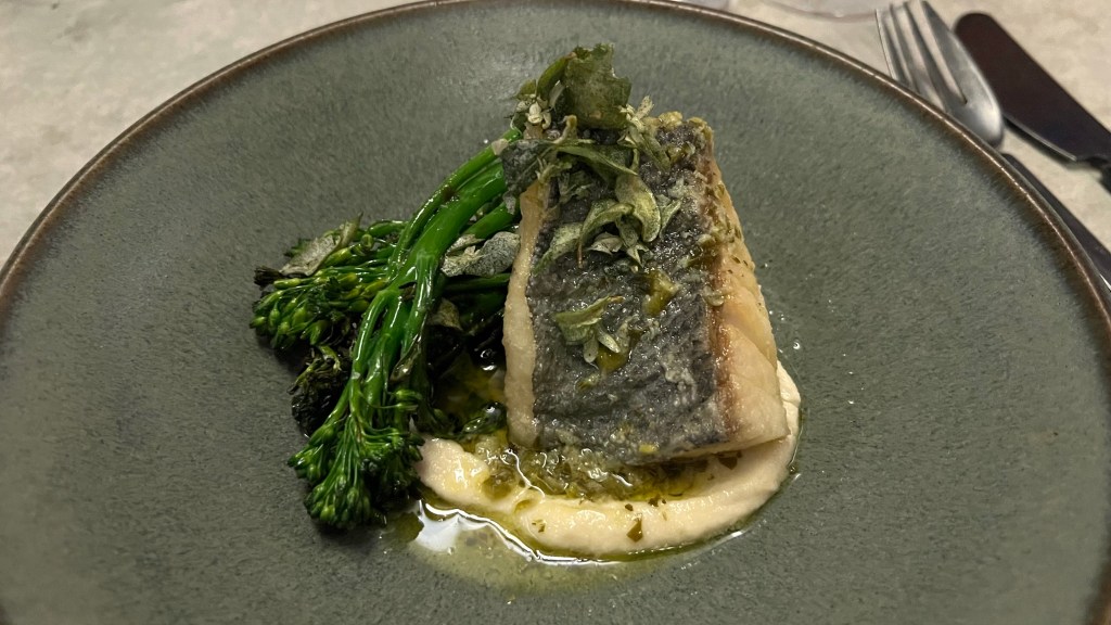 The next course was blue eye trevalla with crispy skin on a macadamia puree with lemon, and grilled broccolini (called brassica in Australia). The macadamia puree was quite salty but the whole dish worked great together as a combination of flavors and textures. It was paired with a Stoney Rise Savignin 2023 from the Tamar Valley, Tasmania, which was a great pairing. The Savignin was not at all like Savignin from the Jura (which can be high acidity and/or in an oxidized style) but was full bodied with enough fruit intensity to handle the bold flavors of the dish. The best dish and wine pairing of the menu.