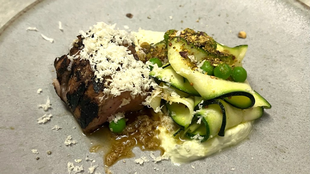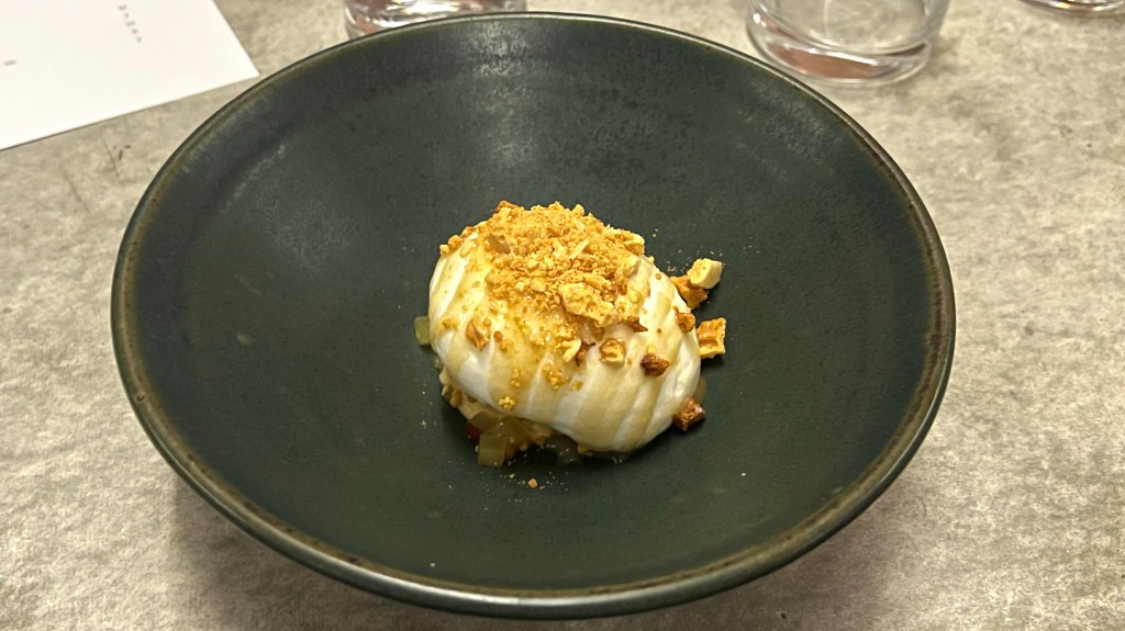Next was Koji pork with spring pea, curd, a horseradish sauce, and thinly sliced zucchini. The horseradish sauce was quite piquant, but the dish did work well with the Sonnen ‘Plenty Red’ Pinot Noir 2022 from Derwent Valley. Tasmania. For this wine was 5% Riesling cofermented with the Riesling, which had given the wine some aromatic and acidic lift. The wine was better with the dish than without it.