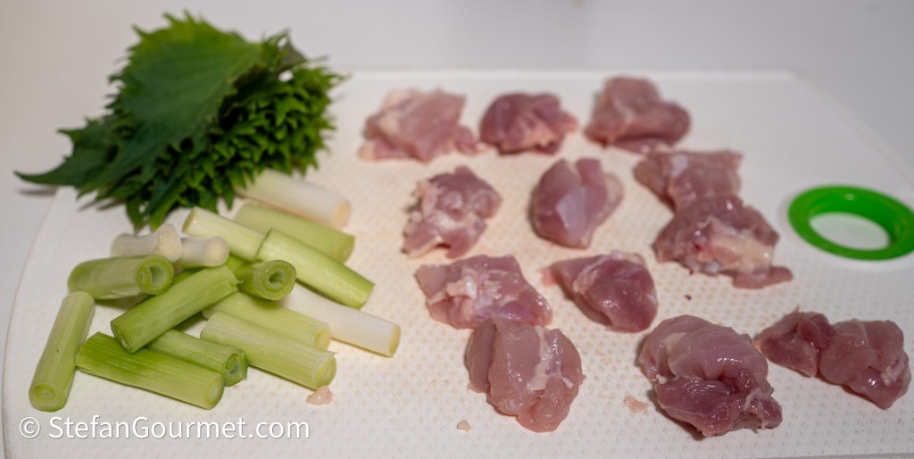 Wrap each piece of chicken in a shiso leaf. Put the scallions and the shiso-wrapped chicken on skewers, alternating between scallion and chicken, and starting and ending with scallion. Each skewer has 4 pieces of scallion and 3 chicken pieces.