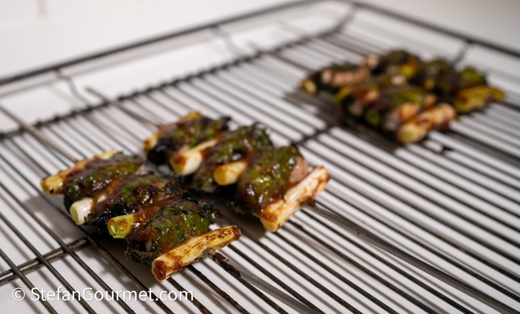 Preheat the broiler (or prepare a charcoal grill). Wash the shiso leaves and leave them slightly wet. Cut the white and light green part of the scallions into 5 cm (2″) lengths to get 16 pieces. Cut the chicken thigh into bite size pieces that can be wrapped by a single shiso leaf. Remove the pits from 2 umeboshi and puree them with a tablespoon of soy sauce and a tablespoon of vegetable oil.