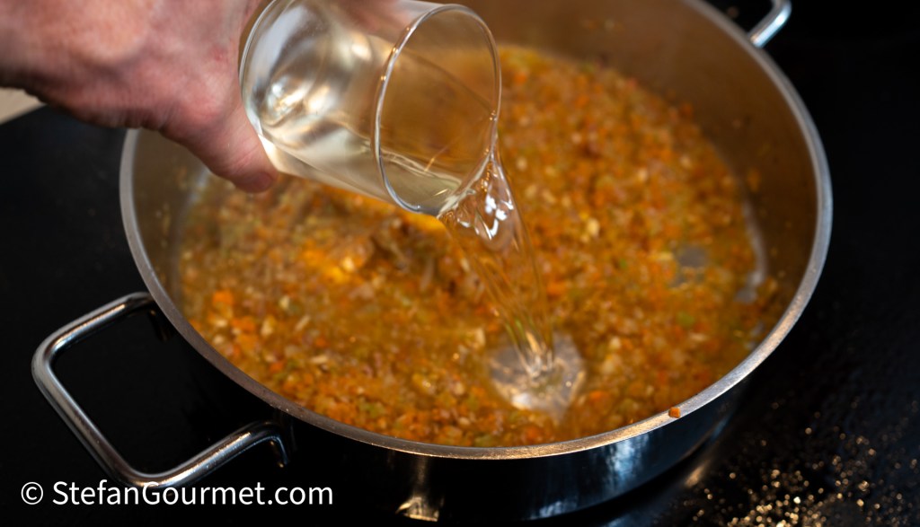 Stir for another minute, then add 250 ml of white wine.