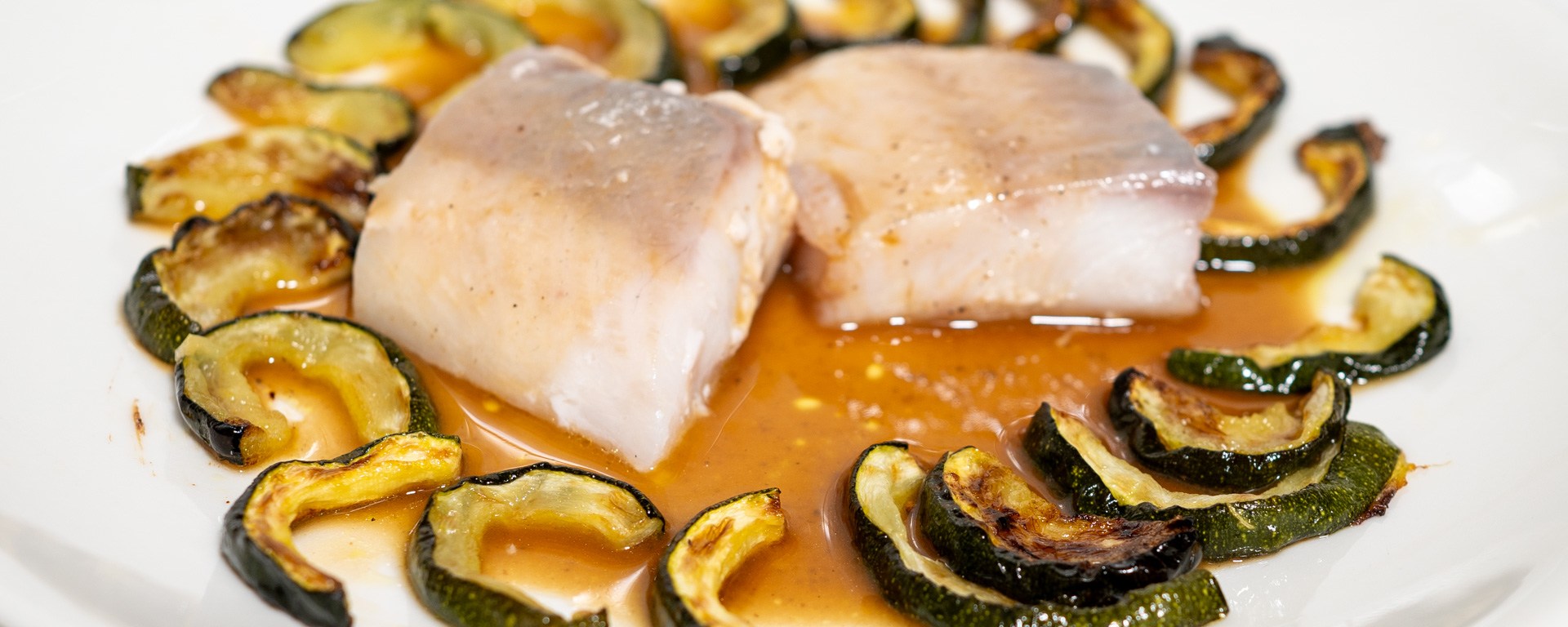 Arrange the zucchini on preheated plates. Take the fish out of the sous vide at the last moment, take it out of the bag, and place it on the center of the plates. It is fine to leave the fish in the sous vide a bit longer if you are not ready to serve after it has been cooked for 30 minutes. You should serve it as soon as possible after you’ve taken it out of the sous vide, as 50C/122F is the perfect serving temperature, which means that it will cool off below perfect serving temperature pretty quickly. To help prevent this, spoon the sauce over the top of the fish. Serve right away with a slice of lemon.