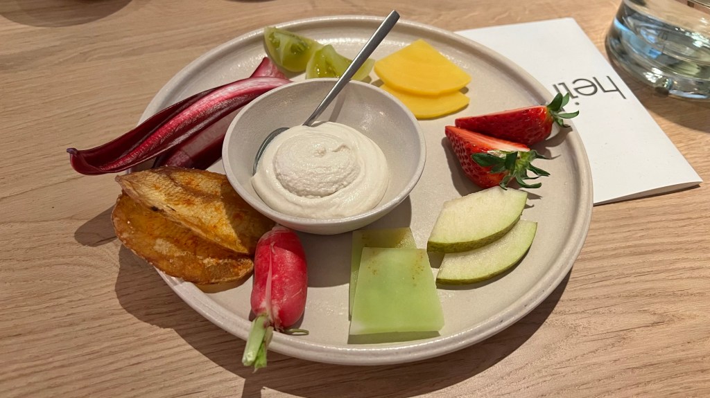 The amuses bouches consisted of three parts. The first part was a plâteau de crudité (raw vegetables and fruits) with a smoked cashew dip. It was a nice selection, but the cashew dip didn’t taste smoky and not very much like cashew.