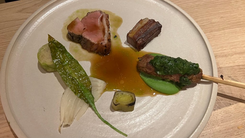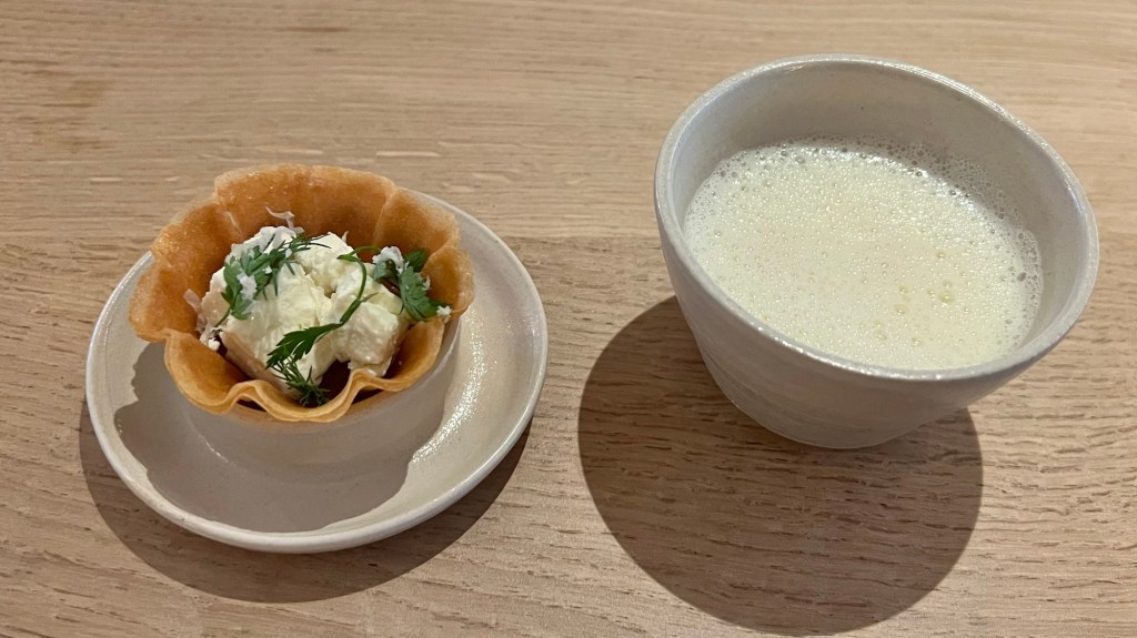 The second and third part were a tartlet with cheese, lovage, and horseradish, and asparagus soup with grapefruit. I didn’t care for the grapefruit in the asparagus soup, not sure what it added.