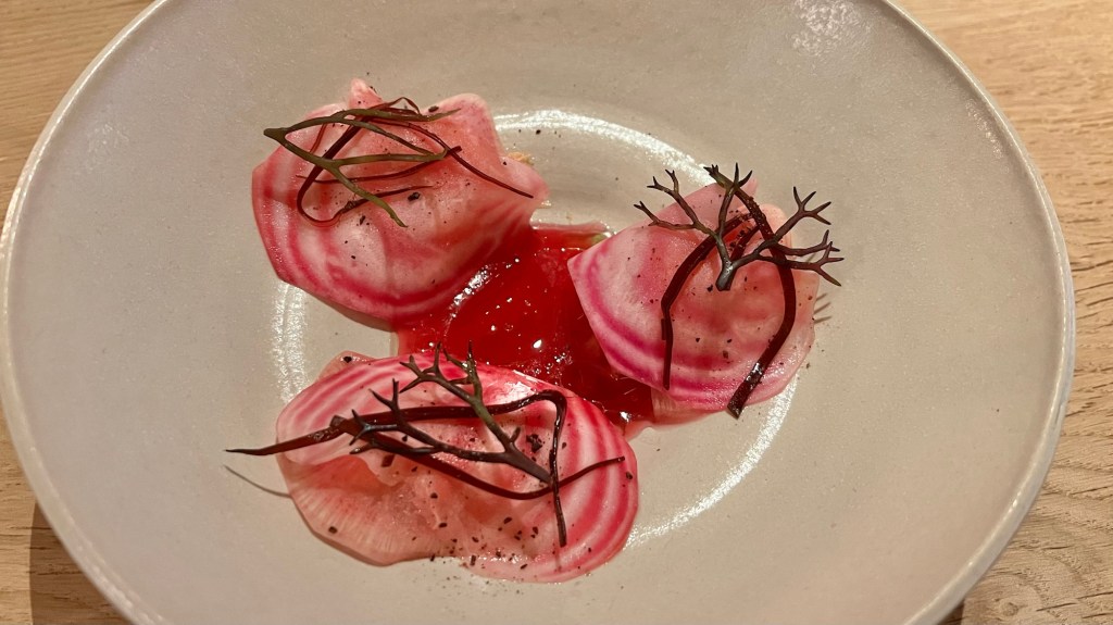 The first course of the chef’s menu was smoked trout with chiogga beets, rhubarb, and seaweed. The rhubarb didn’t really stand out, but I consider that a good thing. The trout was very nice.