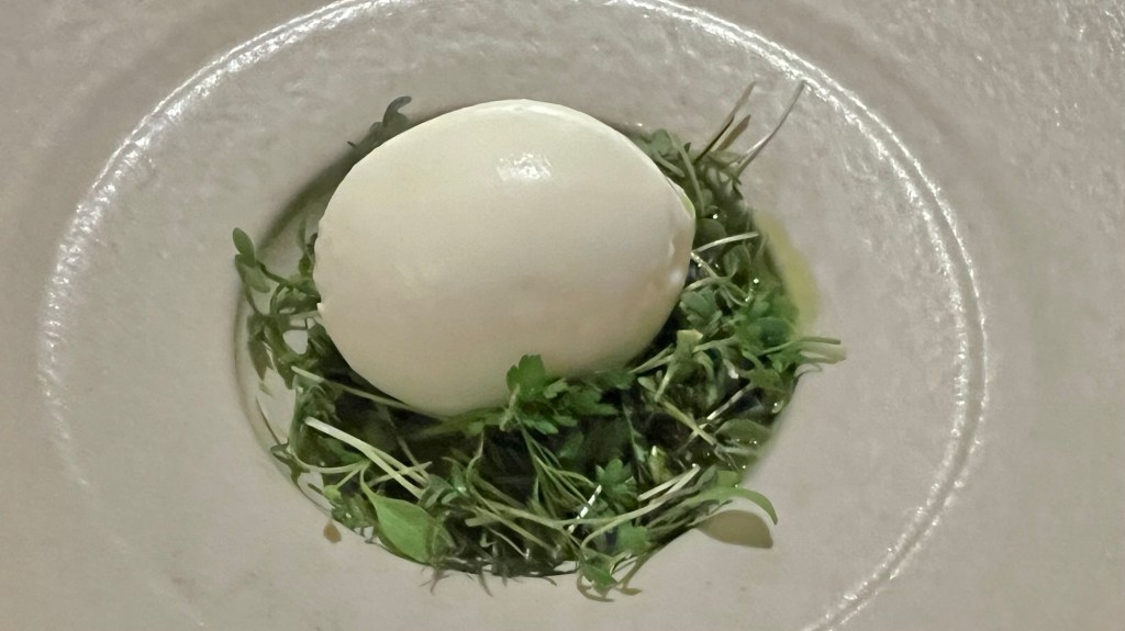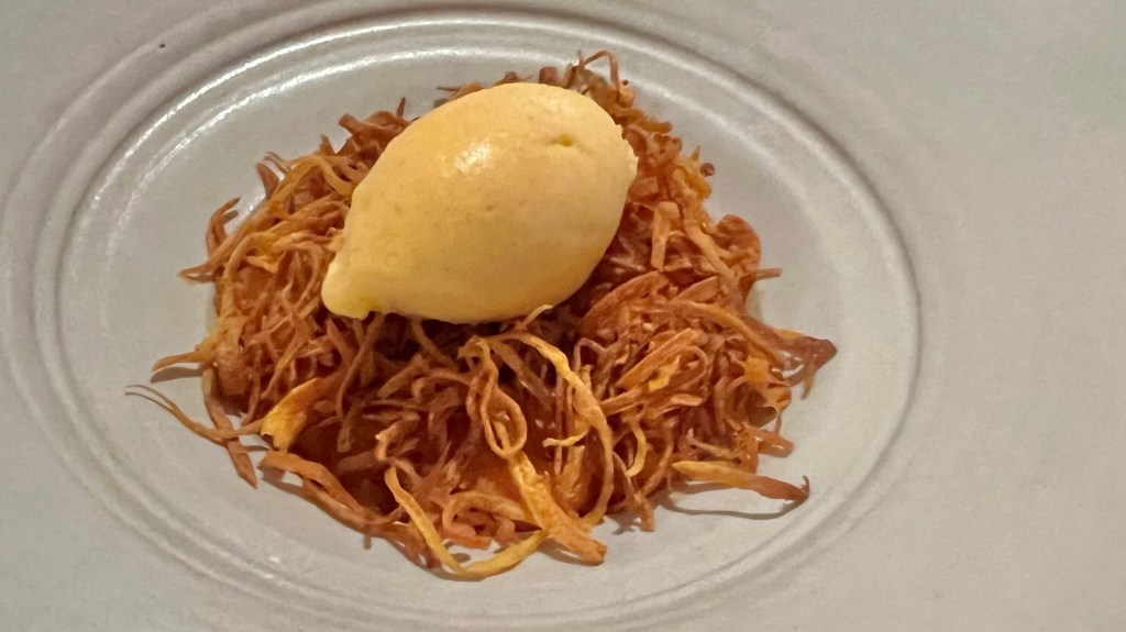 This was a good pairing for the sheep yogurt sorbet with cress. I liked the sorbet, but there was too much cress; it tasted ‘too green’ for my liking.