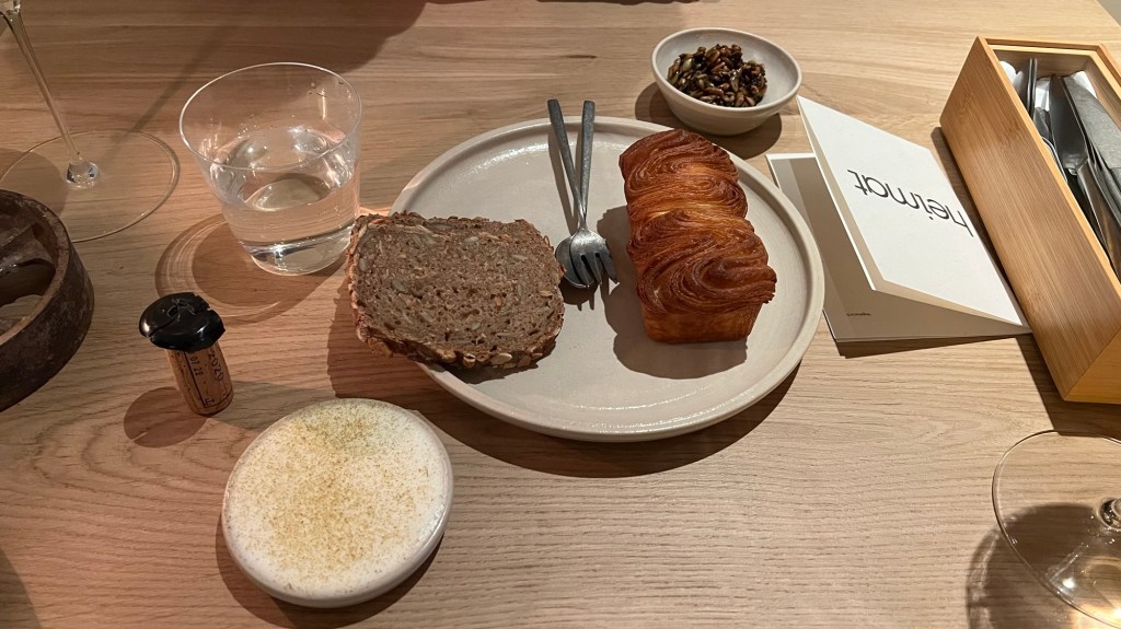 Next was a bread course of rye bread and layered brioche with caramelized seeds and whipped goat butter. The brioche feuilleté was like a croissant and must be a lot of work to make. I liked the seeds.