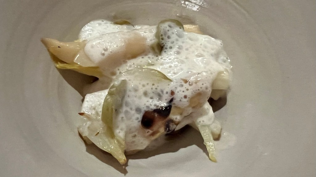 The fourth course and final course we enjoyed with the Meursault was barbecued white asparagus with caremelized witlof (endives), ajo blanco, and kiwi berry. The white asparagus had been barbecued without peeling them, and then peeled to serve. This removes the barbecue flavor, and on a few pieces that still had some of the charring, it tasted more burnt than smoky. The asparagus without charring were fine, but hadn’t really benefited from the barbecue. The caramelized witlof was sweetened with sugar. According to the wait staff, the sugar was added because during the trial week guests had complained about the bitterness of the witlof. It was still bitter with the sugar, and too strong a flavor to go with the elegant flavor of the asparagus. This was our least favorite dish of the menu.