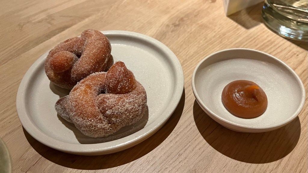 Coffee or tea was accompanied by a doughnut in an unfortunate shape with a pumpkin and bearclaw dip. The doughnut was just a doughnut, and the dip didn’t taste as interesting as it sounds (and didn’t stick well to the doughnut).