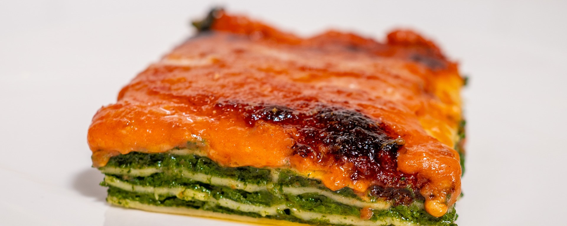 If using a 20 x 20 square dish, use 6 layers of pasta, 4 layers of spinach, and 2 layers of pink sauce: from below this means pasta, 1/4 of the spinach, pasta, 1/4 of the spinach, pasta, 1/2 of the pink sauce, pasta, 1/4 of the spinach, pasta, 1/4 of the spinach, pasta, 1/2 of the pink sauce.