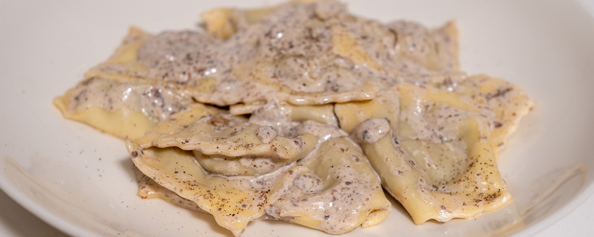 Pasta alle Cenere literally means “pasta with ashes”. This name does not refer to the flavor, but to the appearance of the dish. It is pasta with a sauce of gorgonzola (Italian blue cheese), black olives, and cream. Freshly ground black pepper is added on top to make it look even more like ashes. As I love to make ravioli, I thought it would be nice to make ravioli alle cenere. The ravioli are stuffed with gorgonzola mixed with ricotta, and served with a sauce of cream and olives. The regular recipe uses gorgonzola dolce (mild gorgonzola), but as I was mixing it with ricotta, I used gorgonzola piccante. For a richer version you could also use gorgonzola mixed with mascarpone, also known as magor or gormas.