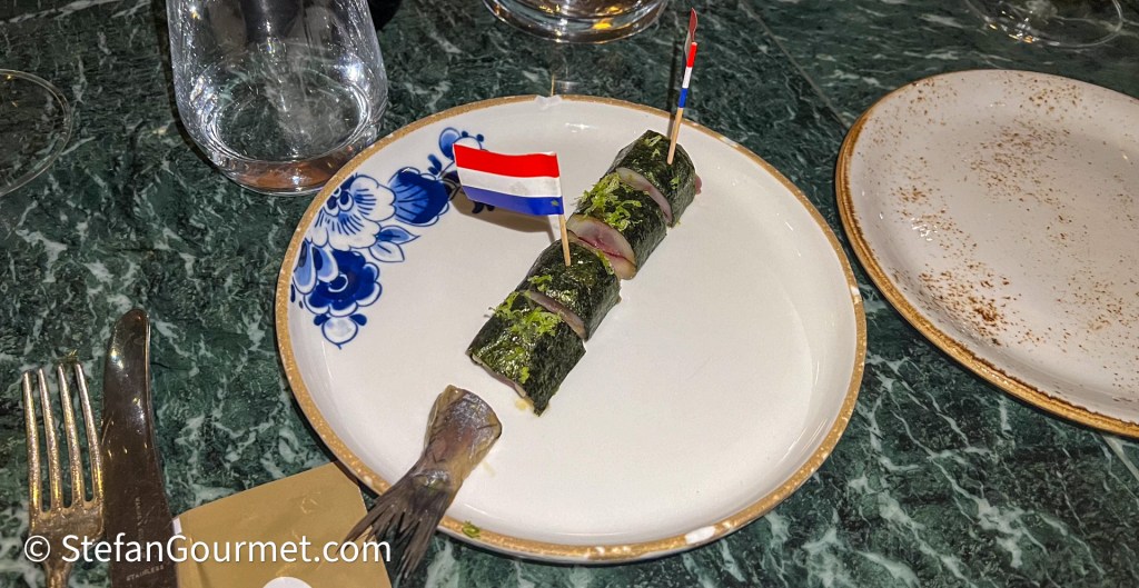 Ron Blaauw is a famous Dutch chef who used to have a two Michelin star restaurant, but now has four branches of “Ron Gastrobar“, of which the original one near the Vondelpark in Amsterdam has held a single Michelin star since 2014. The philosophy of the gastrobars is to get high quality food in an informal setting. As a party of 2 the seating is literally at the bar (the tables around the bar are for 3 or 4). I had not been to Ron Gastrobar since 2013 (read about that here). Because I really liked the food back then, I decided to take my friend Robert there for his birthday. Since then the formula has changed: you can now pick 3 courses (49.50 euros) or 4 courses (69.50 euros) from the menu. That sounds like a very good deal for a Michelin star and it is, but everything is separate on your bill, like bread for 7.50 euros or snacks (amuse bouche) for 8-12 euros. There are also some specials, like the Tournedos Rossini (59 euros) that we ordered.