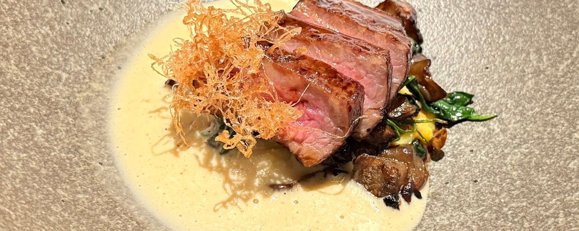 This was a good pairing for the dhufish with a butter sauce flavored with highly concentred stock of fish bones, with young scallions, and some caviar on top. The young scallions from the restaurant’s garden were nicely sweet and a nice contrast with the caviar. The fish could have been cooked slightly less, but otherwise a very nice dish.