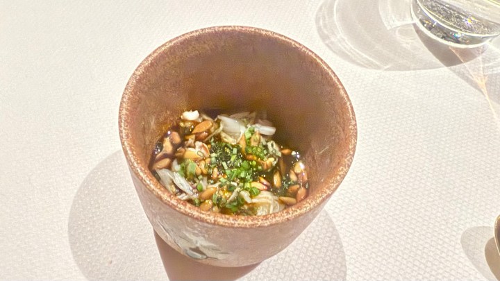 Compared to 2023, the price of the chef’s menu has been increased from 185 to 220 euros (more in line with the two stars), and the wine pairings from 14.50 to 18 euros per glass (still cheap compared to the food). We opted for the chef’s menu with wine pairing, but asked Jasper to propose upgrades from the premium wines by the glass. Compared to last time, those wines were now better suited to be paired with the chef’s menu.