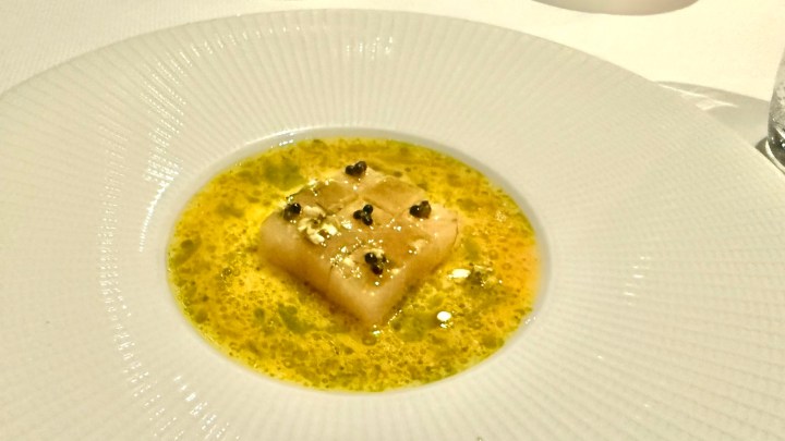 It was a great wine, although perhaps not the best pairing for the langoustine with Lardo di Po, tiny Nashi pear brunoise, and a bisque enriched with duck foie gras. This dish was quite similar to the langoustine dish from my previous visit. Which I did not mind, as it was delicious with a very good balance of flavors in the bisque, and perfect cuisson of the langoustine.