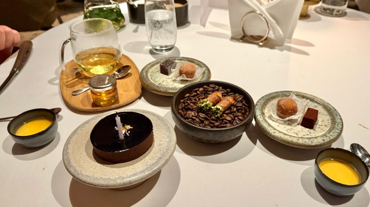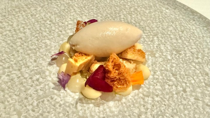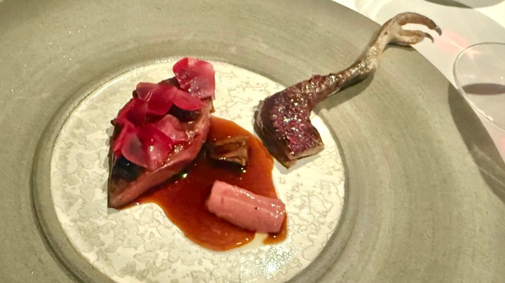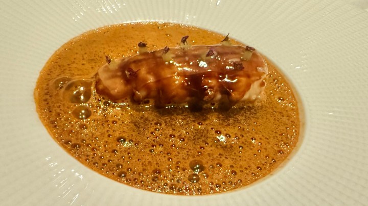 The next wine was a field blend of Syrah, Mourvedre, Touriga Nacional, and Trincadeira from South Africa. The sommelier told us he had selected this wine because it includes some of the same grape varieties as Port. As the next dish is made with Port, but Port didn’t work as a pairing, this is what he came up with. And it worked!