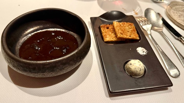 The dish was black winter truffle, poached in port, and served with einkorn toast, truffle butter, and Murray salt. The idea was to spread some truffle butter on the toast and then put some truffle shavings with port jus on top. Delicious and a great pairing with the wine.