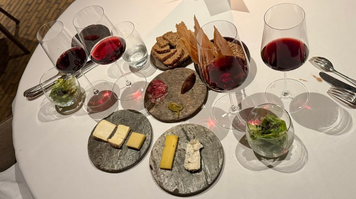 We asked for some wine to go with the cheese, and as usual the cheeses were so different that one wine was not going to work. So Jasper got us half glasses of two wines: a Soutch African Cinsault…