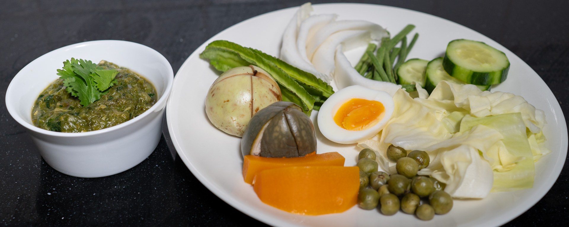 When I was in Chiang Mai in Northern Thailand, I followed a private cooking lesson, and tried several local restaurants. A dish that featured on the menu of local restaurants that serve Northern Thai food was “hors d’oeuvres”, an assortment of various raw and steamed vegetables, sausage, hard-boiled egg, and pork crackling with “dips”. The second recipe for such a dip that I am sharing with you is Nam Phrik Num, also written as Nam Prik Noom. It was not featured in my cooking class, but we did get this at all of the restaurants. Its main component is roasted green chillies, but it is only mildly spicy. We especially enjoyed it as a dip for various types of (pork) sausage, but it also worked well with the various raw and steamed vegetables.