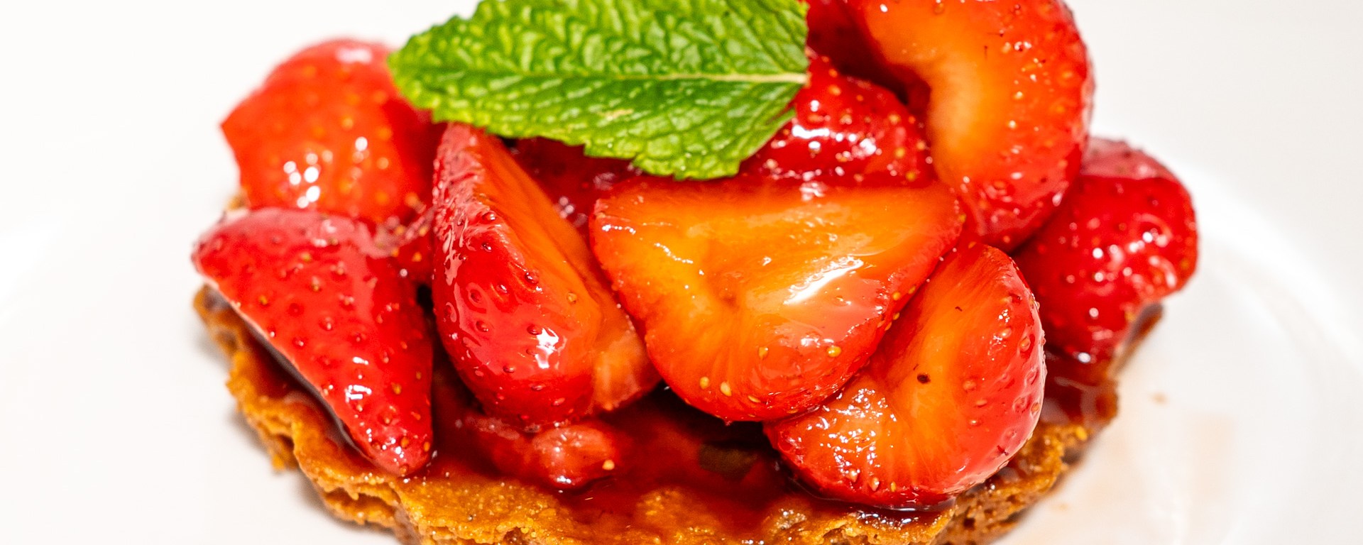 Place the strawberries on top of the almond shells, together with some of the glaze. Garnish with a fresh leaf of mint.