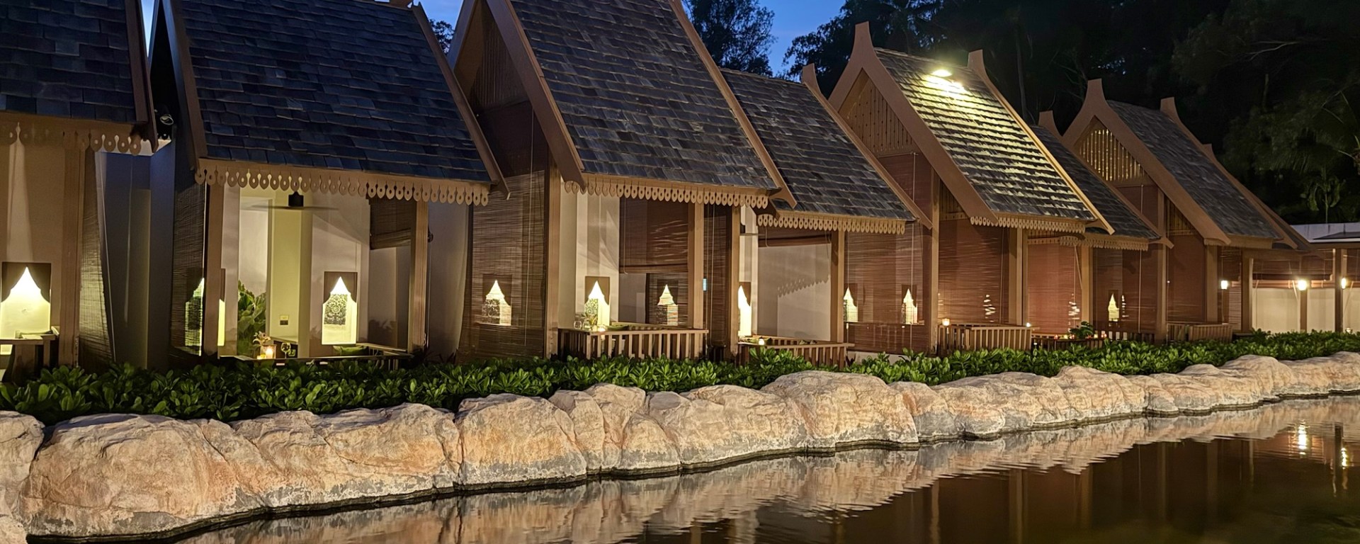 Am laughing as I keyboard having just finished and early dinner and nibbling from a fruit plate almost a copy of yours, including the dragonfruit 🙂 ! Since I wanted to be an architect/designer methinks you will understand the dining cabins getting the first loud clap. Another goes to the photo of the two of you . . . one of the best I have seen. The food . . . I am certain it tasted fine but somehow did not look very Thai to me . . . do like the look of the pandan jelly dessert which is not usual for yours truly! Would not have minded the morning glory tempura or the grilled prawns . . . thanks for taking the trouble to write . . . and have a good flight . . .