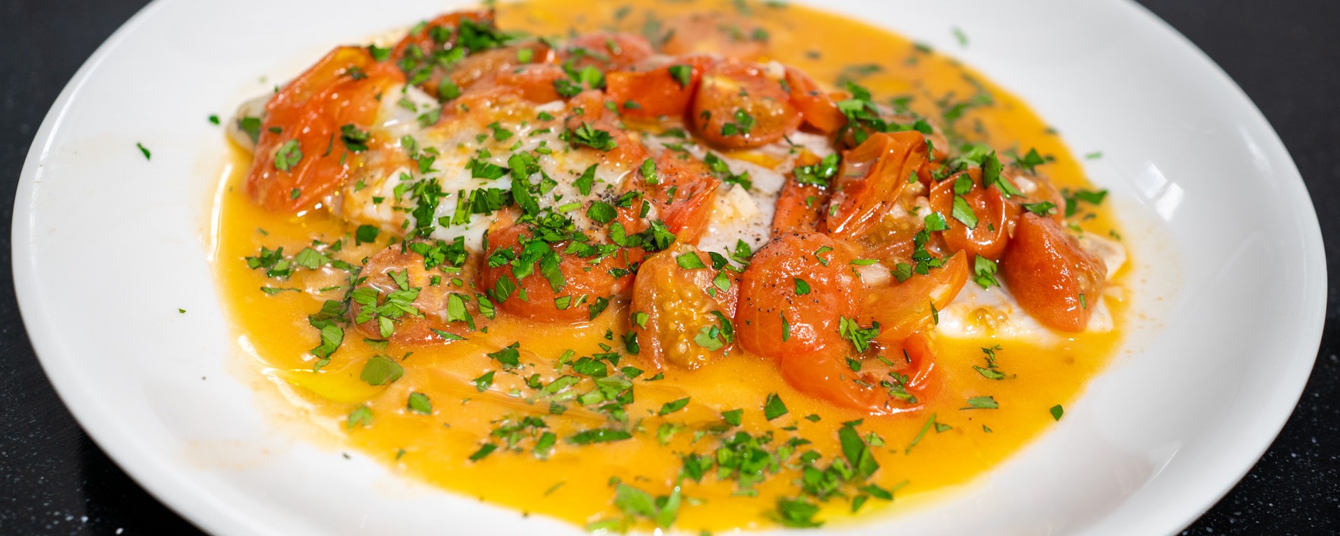 Carefully transfer each fillet to a preheated plate. Bring the remaining broth to a boil, then pour the hot liquid and tomatoes over each fillet.
