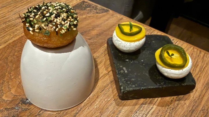 Two amuse-bouches were served: one featuring a cream of dill and the other a sweet macaron with jalapeño and smoked mackerel, although the flavor of the mackerel was barely perceptible.