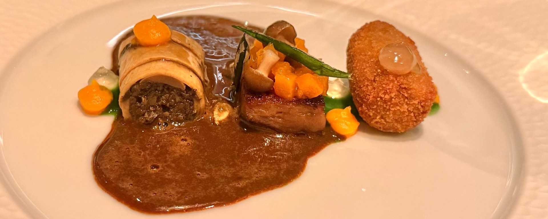 We continued with a vegan dish featuring several types of mushrooms in various preparations, including lion’s mane, accented by a touch of pumpkin. It was an exceptionally flavorful dish, anchored by a deep and savory mushroom jus.