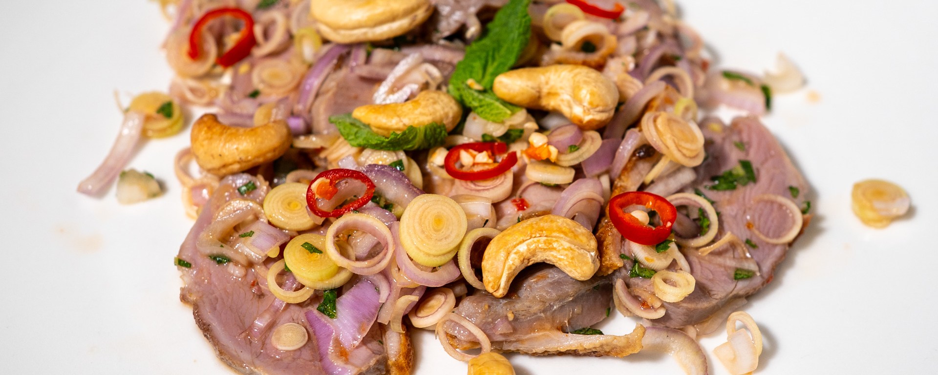 Garnish with the roasted cashews, sliced chilli, and a few mint leaves, then serve at once.