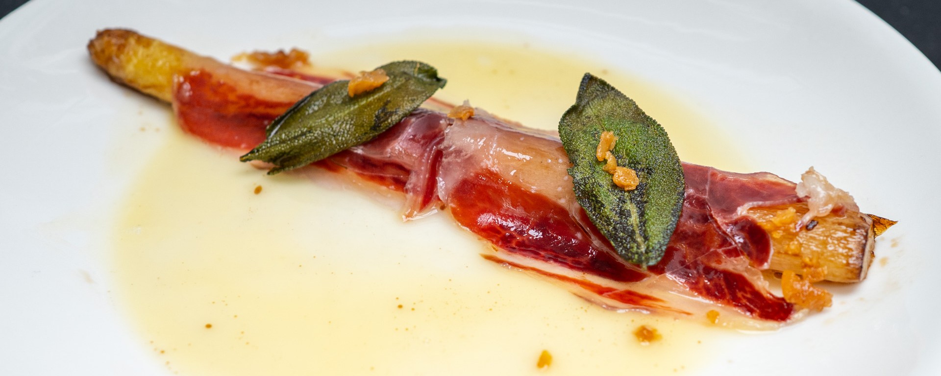 It is the season for white asparagus in the Netherlands. The classic way to serve them is with boiled ham, eggs, and Hollandaise sauce. Three years ago at Michelin starred restaurant De Juwelier they served asparagus with prosciutto and a sage mousseline sauce. The asparagus were slightly charred and the combination worked very well. Giving the asparagus more flavor by charring them enables the substitution of the classic boiled ham with prosciutto, and the combination of prosciutto and sage is classic.