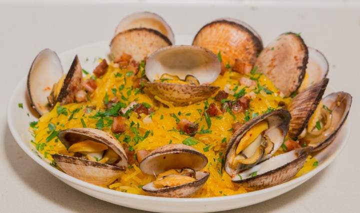 Have you ever heard of spaghetti squash? I had not until I read about it on Shanna’s wonderful blog. Coincidence or not, this autumn for the first time I saw spaghetti squash in markets here. The name may sound strange, but … Continue reading Spaghetti Squash with Clams and Pancetta