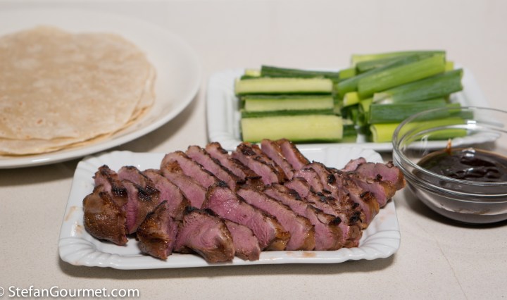 I love Peking Duck, but I always thought it was very difficult to make at home. I could hardly believe it when I saw the very simple recipe described by Stéphane on his blog My French Heaven. He just boils the whole duck with some honey and soy sauce, allows it to dry in the refrigerator and then roasts it for 1.5 hours at 250C/480F. I tried this and the result was quite good! Thanks Stéphane! Peking Duck is one of my favorite Chinese dishes. You eat pieces of crispy skin with some cucumber and scallions with a sauce, rolled … Continue reading Simple Peking Duck