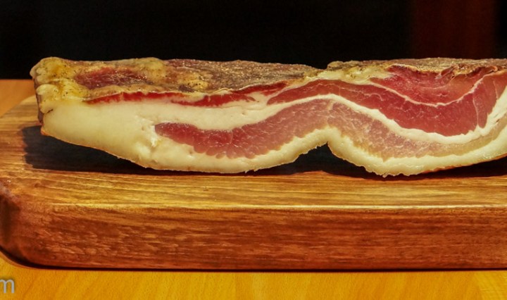 Pancetta is Italian cured pork belly. I had looked into making it myself before, but the recipes I found required a curing chamber. A curing chamber is a cabinet with controlled temperature and humidity. Even for me it seems over the top to own one. But then I realised that pancetta was originally invented to preserve pork belly when refrigerators had not yet been invented (let alone curing chambers), so I figured that a cellar should do the trick as well. We don’t have a cellar, but in winter our garage comes pretty close with a temperature around 16ºC/60ºF. So I compared many recipes I found online on Italian blogs, on American blogs, and in the end based my first homemade pancetta upon a Dutch blog called missFromage (I bet Shanna likes that name!).